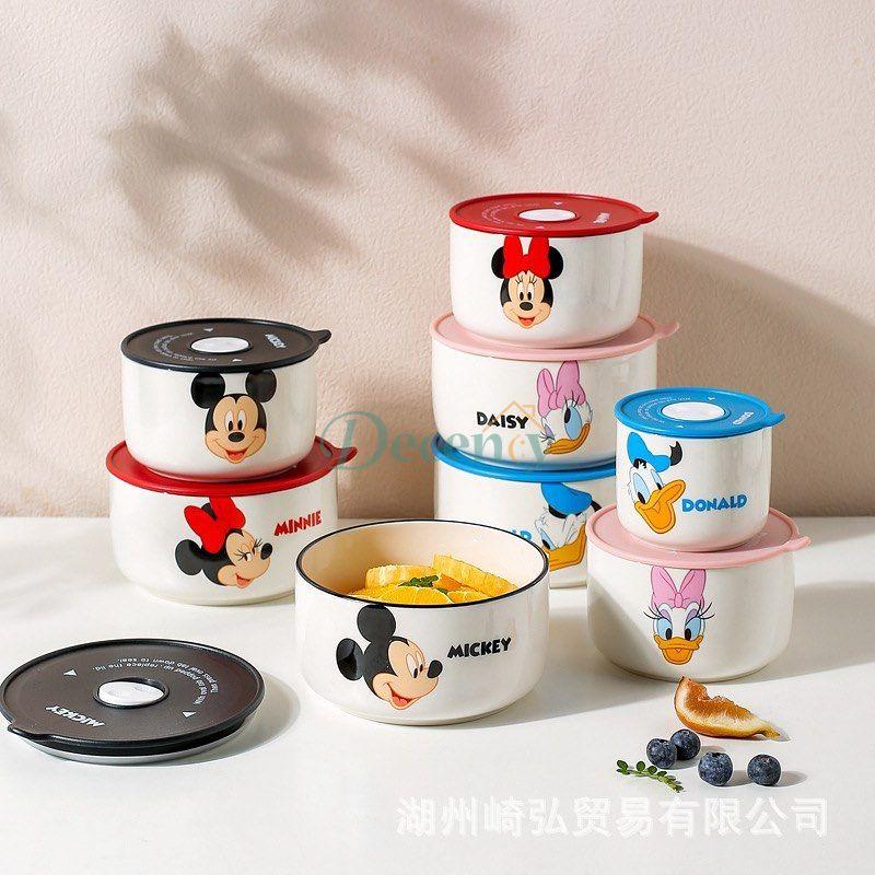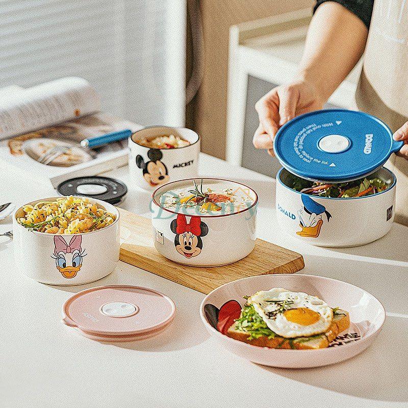 Disney Ceramic Bowl With Lid Microwave Oven Bowl 3 Pcs Student Thicken Lunch Box