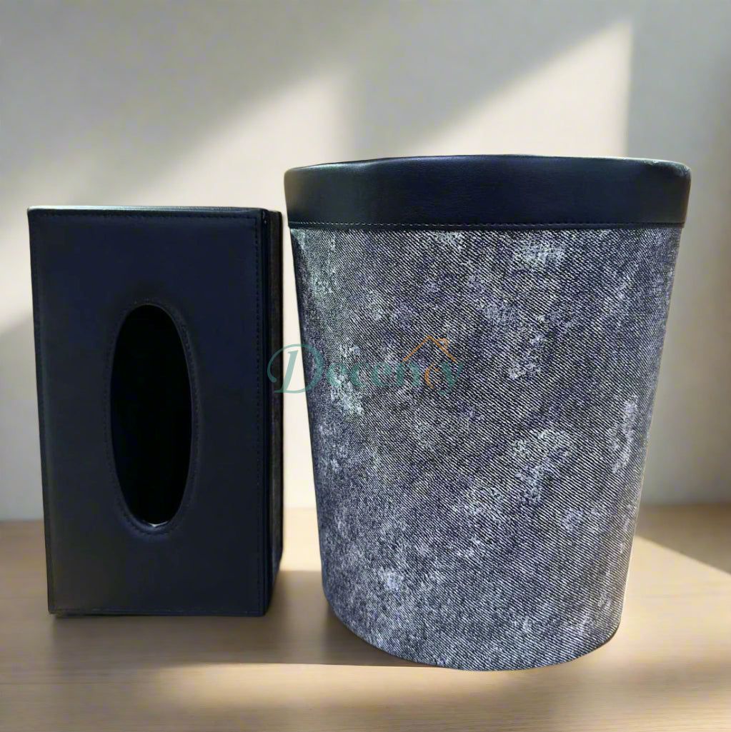 Enhance your space with this sophisticated faux leather tissue and dustbin set, designed for both style and function. Featuring a sleek grey suede-textured finish, the cylindrical waste bin pairs perfectly with the matching rectangular tissue box holder. Ideal for offices, bedrooms, or living areas, this duo adds a touch of modern elegance while keeping your environment tidy and organized.