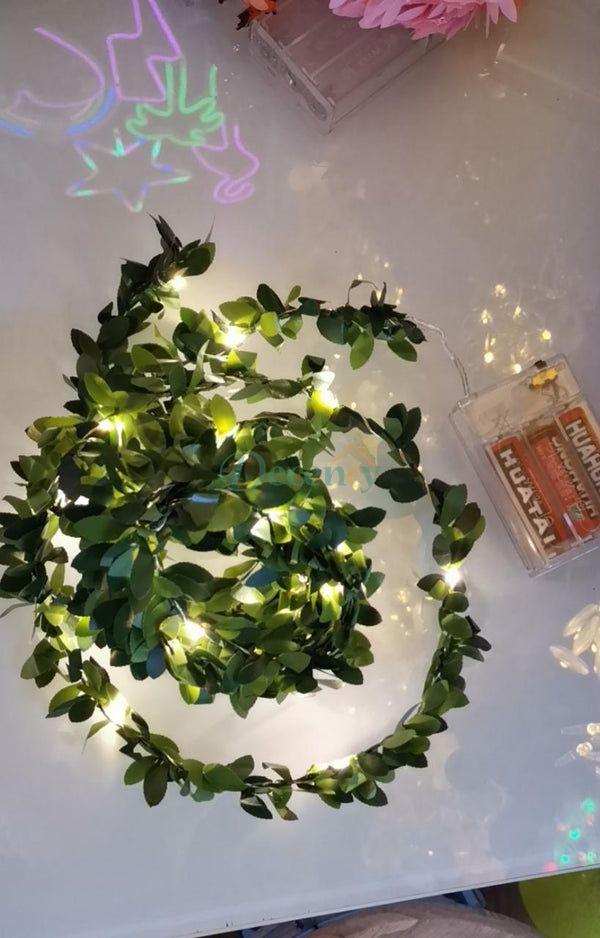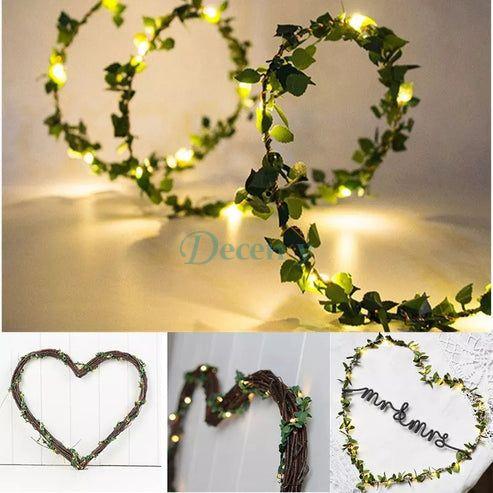 - A very delicate, green leaf string light garland! All along the garland is twisted a copper wire containing tiny LEDs in a warm white color, which make the garland appear to glow, can be bent to any shape you want, and add a beautiful decorative accent.