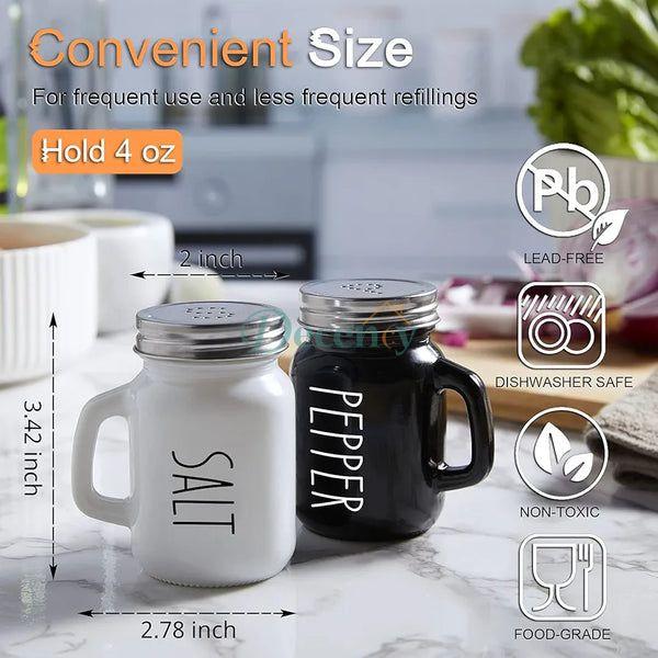 Cute and Stylish : White and black glass bottle is very eye-catching, with stainless steel lid, Measuring 2" x 2.8" x 3.5", they are easy to hold and use. clean design let your family and guests love this vintage salt and pepper shaker set