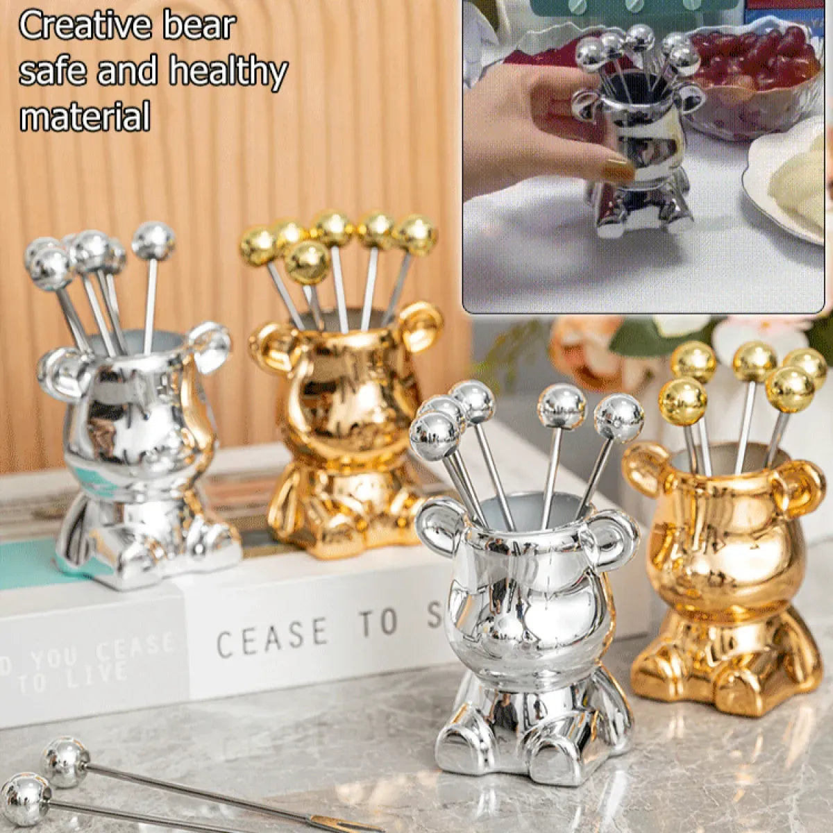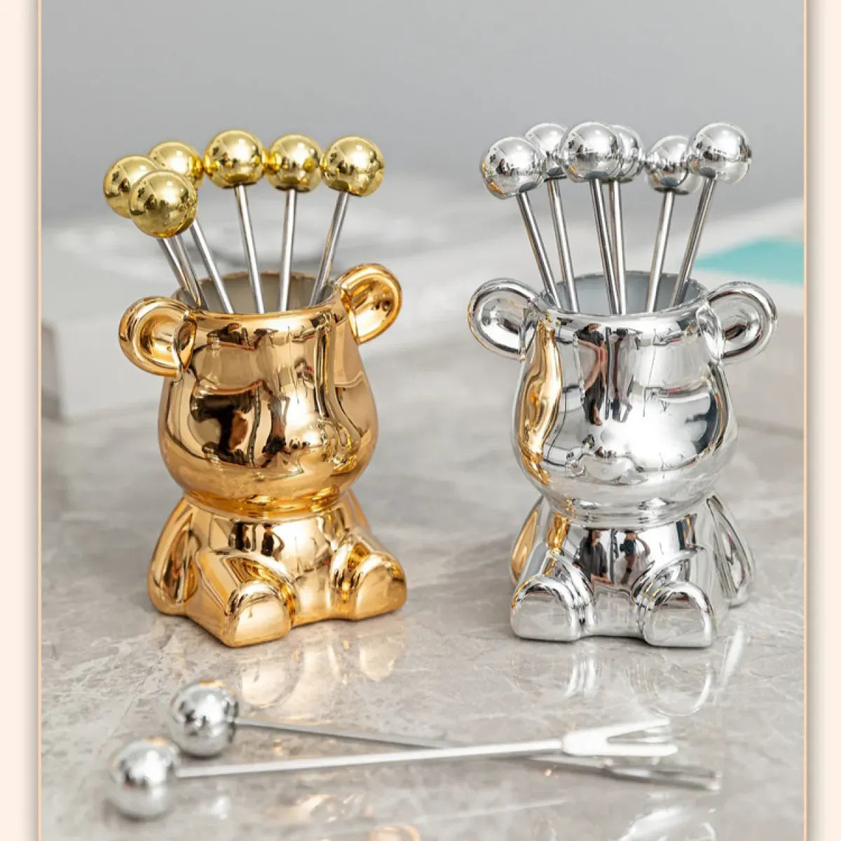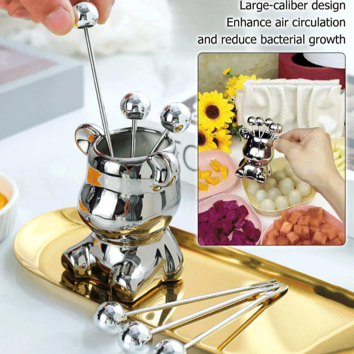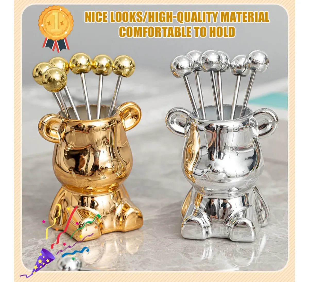 Add a touch of elegance to your dining experience with this Stylish Bear Design Fruit Pick Set. Featuring a golden bear holder with sleek serving picks, this set is perfect for serving fruits, snacks, appetizers, desserts, and more. The durable stainless steel picks with golden finish ensure long-lasting use, while the charming bear design makes it a standout piece for parties, family gatherings, and everyday dining. Ideal for both home and gift purposes, this set combines functionality with luxury style.